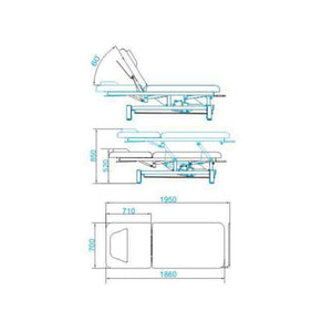 high performance couch, especially for physiotherapy treatments. equipped with 1 motor, the height is electrically adjustable, the backrest and the inclination are manually adjustable. the headrest is a cushion with a vent.