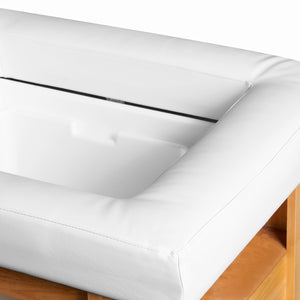 The Head Spa Bali bed is a harmonious combination of functionality and modern design. Its stable structure is reinforced by a solid frame finished with aesthetically pleasing wooden elements, which add warmth and elegance to the interior. The robust construction guarantees stability and durability for long-term use. The ergonomically profiled lounger surface is covered with soft synthetic leather in shades of elegant white, ensuring maximum comfort during treatments and at the same time makes it easy to keep clean. A practical cabinet located under the lounger allows for convenient storage of cosmetics and accessories, ensuring all necessary products are always within reach. The combination of natural wood, soft synthetic leather and ergonomic design makes the Head Spa Bali a stylish and functional piece of furniture for hair salons, SPAs and wellness centres. It is designed to combine comfort of use with a timeless aesthetic.