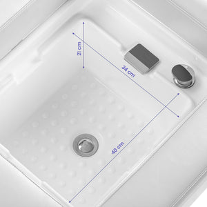 The wash unit is equipped with a mixer tap, allowing for easy temperature adjustment to the customer's preferences. A practical place for the shower head facilitates work, while a plug with a special strainer allows for water flow control and maintaining high hygiene standards in the salon. The water connection is located inside under the bowl and at the back under the shower tray aesthetically concealing the installation. The ergonomically contoured lounger provides comfort and adequate support during treatments, and the included pouffe enhances staff comfort. The combination of functionality and convenience makes this wash station a versatile piece of equipment for both hair salons and SPA parlours.