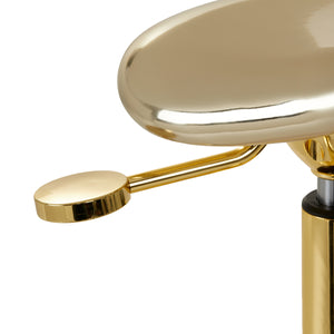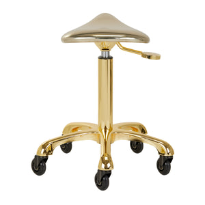 The unique look of the stool is memorable, looks extremely elegant and will be a stylish element of any interior. It will be perfect for both hairdressing and beauty salons. A chrome-plated frame and a stable five-star base with rubber wheels ensure safe use, considerable mobility and the ability to adapt to your needs. Properly profiled in the shape of a saddle, the seat filled with non-deformable foam guarantees comfort to users. The covering made of semi-matte synthetic leather in shades of gold is easy to clean, durable and resistant to moisture.