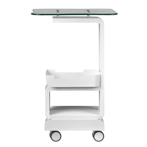 functional, metal and glass table with rubber wheels with a blocking function. Perfect as a table for a cosmetic device. it has a stable shelf for the device and another shelf for accessories, and thanks to the wheel, the table is mobile and easy to move. the piece of furniture provides convenience and comfort during work.