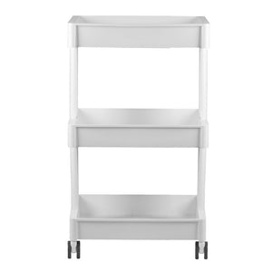 functional plastic table on rubber wheels. the table has three shelves with a rail to prevent the contents from falling out.