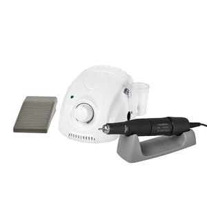 Included: nail drill base, handpiece, power supply, foot drive, silicone handpiece stand, manual.