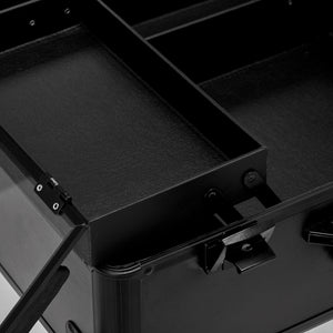 A functional cosmetic box in the form of a comfortable, portable suitcase on wheels. The perfect solution for mobile beauticians or make-up artists. Very roomy. It has four telescopic legs, thanks to which we can properly adjust the height of the station. Lighting on the sides of the mirror. Inside the trunk, there are additionally four folding shelves for small accessories. Black colour.