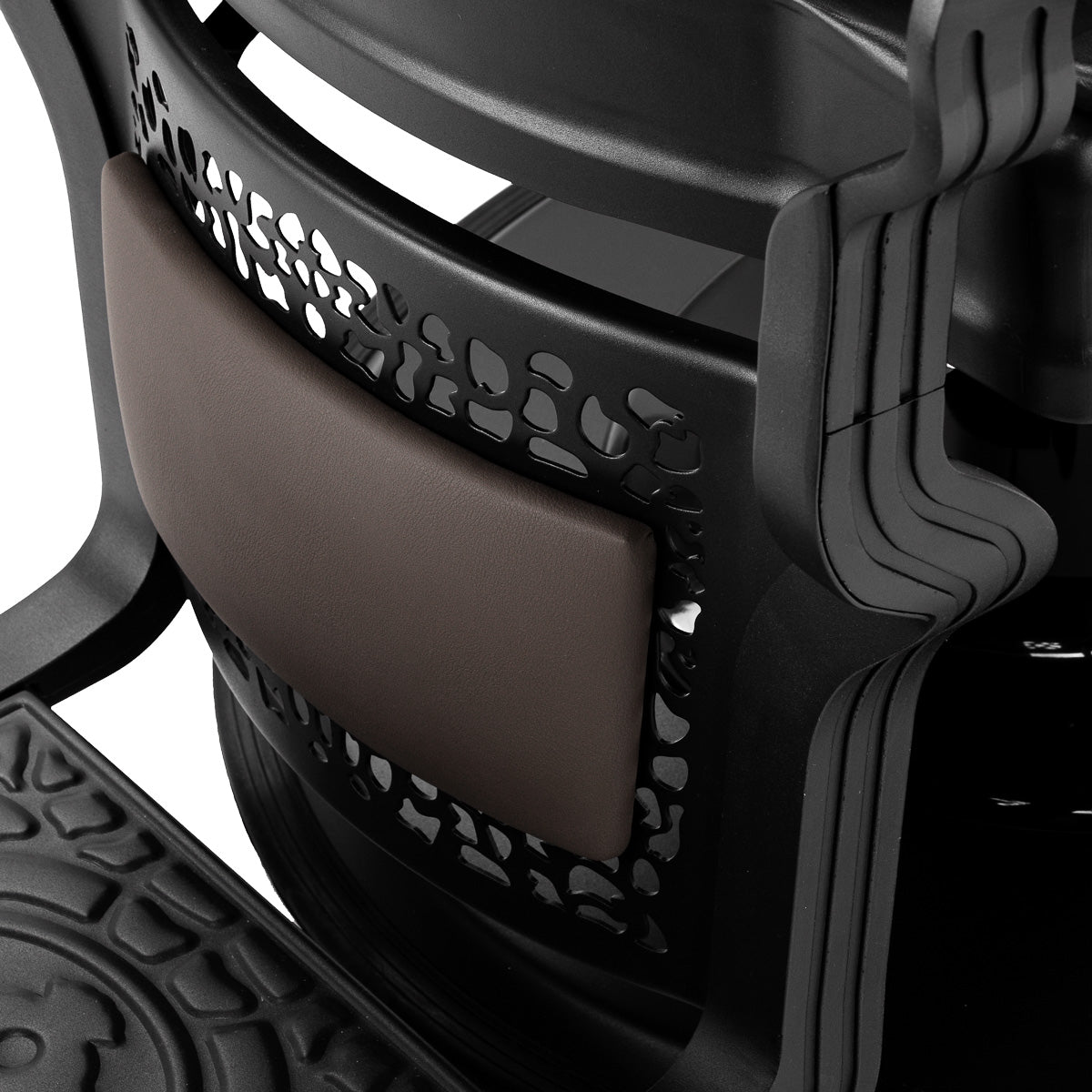 A solid base construction ensures stability and high comfort of use. The seat filling made of durable, deformation-resistant foam and the upholstery made of pleasant-to-touch synthetic leather with a matte finish ensure long-term durability and comfortable use of the furniture. The materials used also make the equipment moisture-resistant, durable, and easy to clean. The cover in shades of brown along with the decorated footrest, gives it a unique character. The chair, with its distinctive design referencing vintage style, fits perfectly into the atmosphere of barbershops, enhancing their unique ambiance.