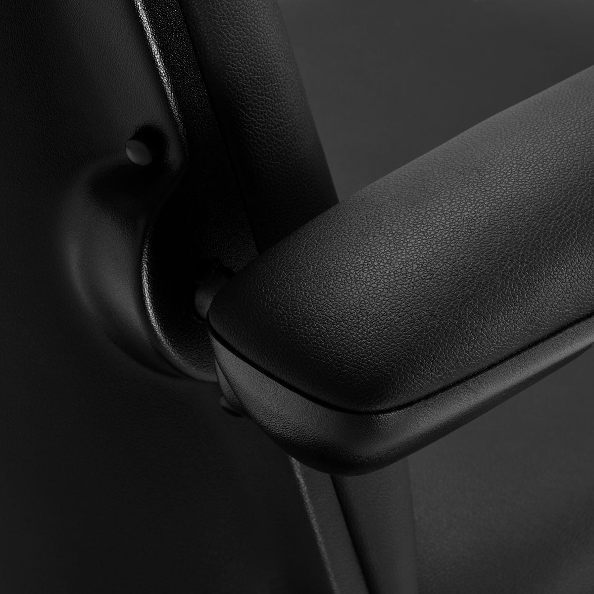 The solid base ensures stability, product durability and comfort of work. The chair is filled with foam and covered with a pleasant to the touch, matte imitation leather in shades of black. Thanks to the use of such material, the equipment is resistant to moisture and easy to clean. The streamlined shape and simplicity of the finish make it look very aesthetically pleasing and will fit into almost any interior.