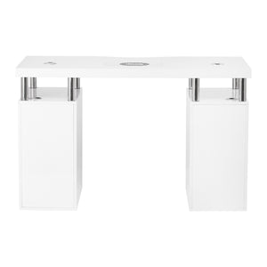 The desk is equipped with two functional cabinets with capacious drawers - there are three smaller ones on the left side and one smaller and one larger one on the right, ideal for appliances. The well-thought-out layout makes it easy to organise the workspace and provides quick access to the most necessary cosmetics and tools. Everything necessary is within easy reach, which promotes smooth and comfortable work. Additional open shelves above the drawers provide ideal space for equipment or frequently used utensils. The desk also features cable holes and grommets, which allow cables to be routed aesthetically and neatly, eliminating unnecessary chaos at the workstation.