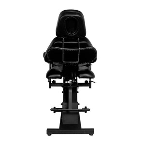 very advanced, adjustable in many planes (height and backrest adjustable with a foot remote), with unlimited possibilities of settings ensuring comfort for both the artist and the tattooed person.