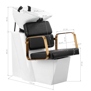 The profiled chair provides adequate lumbar support and, therefore, high comfort of use. Metal armrests in shades of gold with a geometric shape allow for the correct positioning of the customer's shoulders. Filling with durable, deformation-resistant foam and upholstery made of pleasant-to-touch synthetic leather in shades of black ensure the durability of the furniture, ease of cleaning and comfortable use for a long time. The original, elegant appearance of the hair wash unit gives the interior a unique expression. The set includes complete fittings in shades of black, including a faucet, a shower head and dedicated hoses to provide a complete set of tools for work.