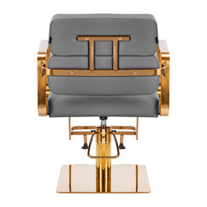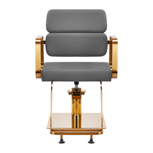The full rotation mechanism of the chair makes the hairdresser's work more effective and comfortable. A solid, flat, square-shaped base guarantees stability during use. The matte-finished, smooth surface gives the element an elegant look and makes it easy to keep clean. A comfortable seat with foam filling ensures high comfort of use, even during many hours of treatments. Geometric, metal armrests in shades of gold allow for the correct positioning of the client's shoulders – this means that he does not bury his head in his shoulders or slouch – which makes it much easier to perform precise treatments, including haircuts. A stylish footrest dedicated to this model provides stable support for the user's feet.