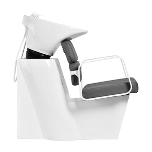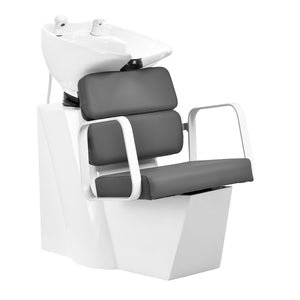 The profiled chair provides adequate lumbar support and, therefore, high comfort of use. Metal armrests in shades of white with a geometric shape allow for the correct positioning of the customer's shoulders. Filling with durable, deformation-resistant foam and upholstery made of pleasant-to-touch synthetic leather in shades of grey ensure the durability of the furniture, ease of cleaning and comfortable use for a long time. The original, elegant appearance of the hair wash unit gives the interior a unique expression. The set includes complete fittings in shades of white, including a faucet, a shower head and dedicated hoses to provide a complete set of tools for work.
