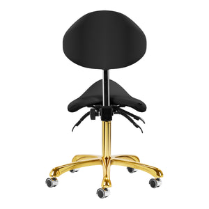 The five-spoke, properly designed base in shades of gold makes the stool stable, even during intensive work. The wheels provide significant mobility, which makes it easier to move the furniture around the office. The upholstery of the durable stool is made of imitation leather in shades of black. Thanks to the use of such material, the stool is resistant to moisture and easy to clean.