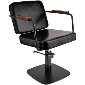 Styling Chair – Industrial Style at Its Best The ENZO styling chair is a perfect match for industrial, boho, and Scandinavian interiors. The combination of metal, wood, and textured upholstery creates a timeless look that gives the salon real personality. Its geometric form draws attention and leaves an impression on every client. Black upholstery