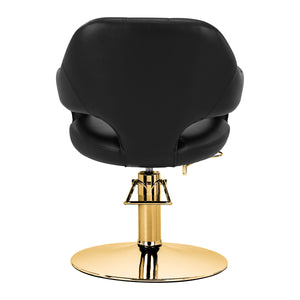 A solid, round base guarantees stability during use. The polished, smooth surface gives the element an elegant look and makes it easy to keep clean. The comfortable seat ensures high comfort of use, even during long hours of treatments. Soft armrests with an interesting shape allow the client's shoulders to be properly positioned – this means that he does not bury his head in his shoulders or slouch – which facilitates the performance of precise treatments, including haircuts. The full rotation mechanism of the chair makes the hairdresser's work more effective and comfortable. Next to the seat there is a practical hairdryer holder, allowing you to quickly put away the equipment.