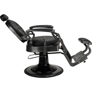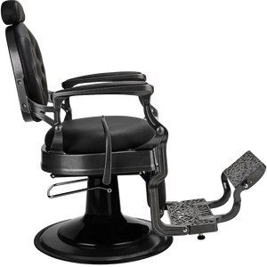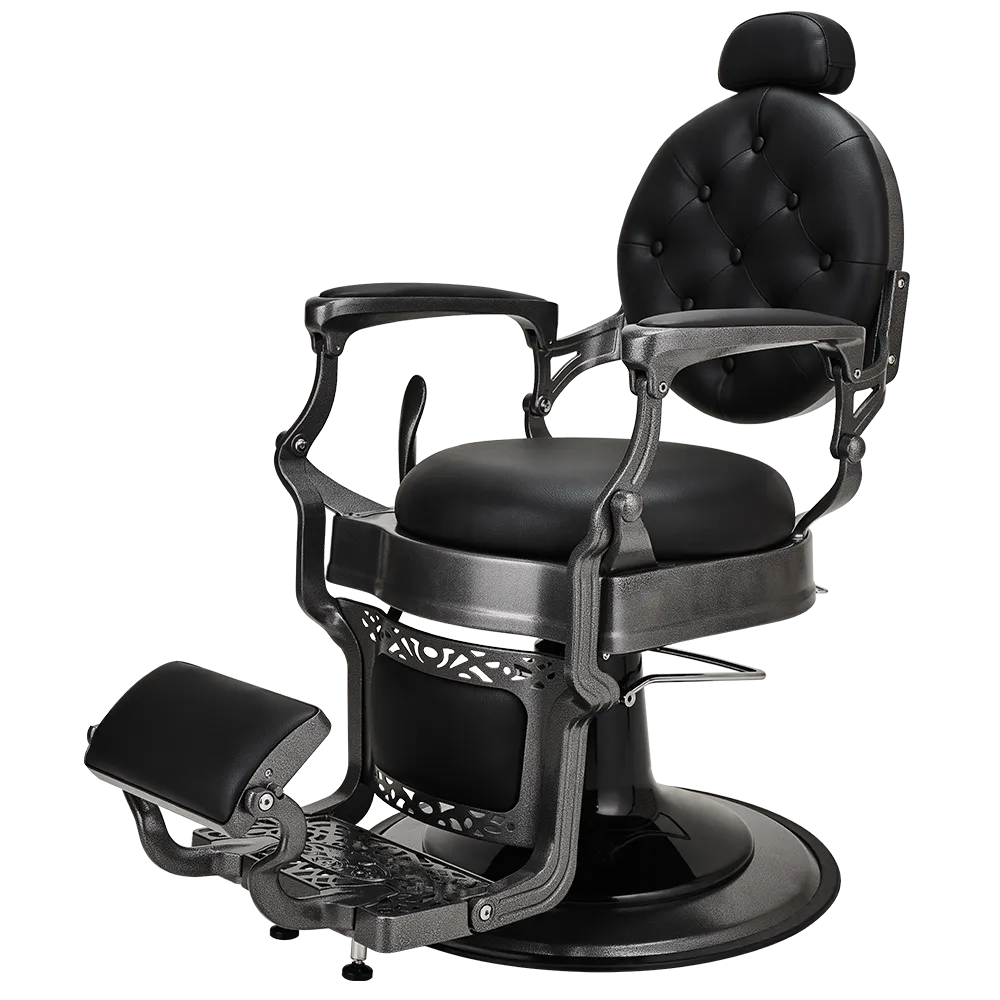 The perfect chair for vintage barbershops. The backrest is padded with buttons, while the elegant black upholstery pairs beautifully with the matte dark metal decorative frame. Black upholstery