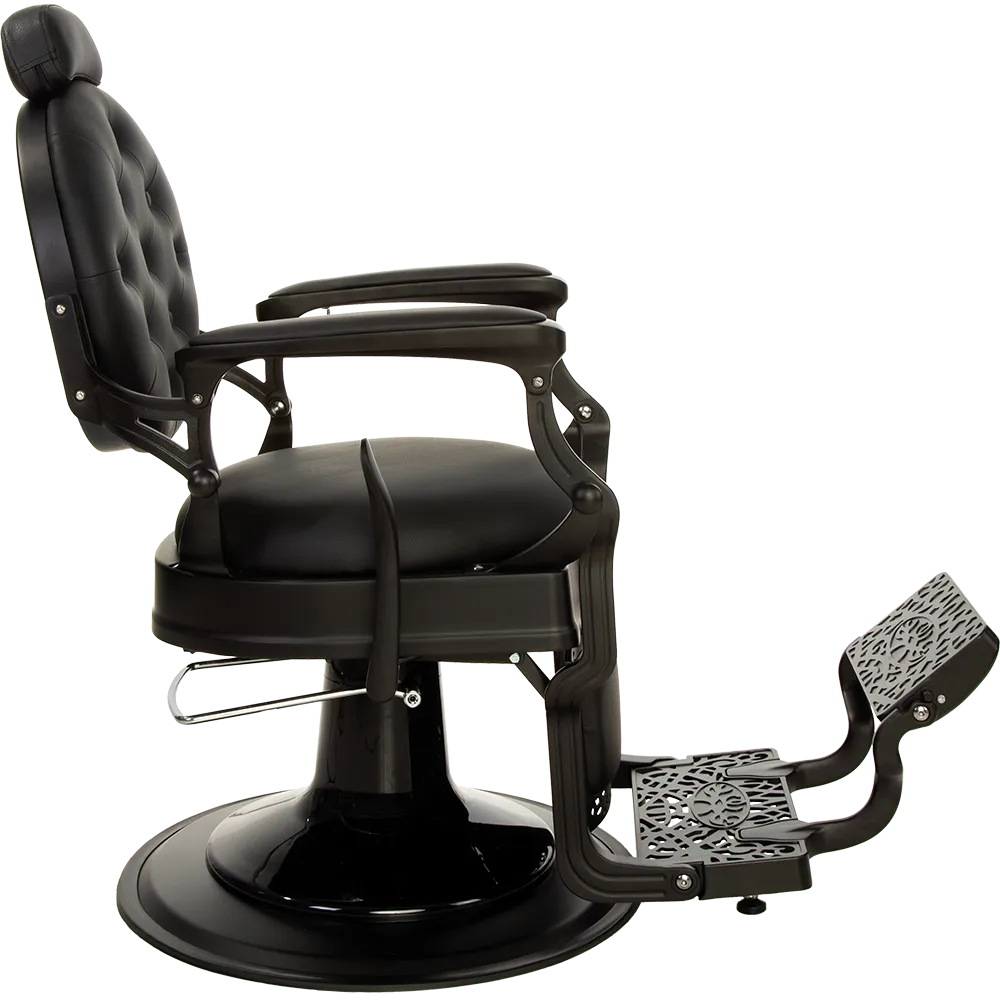 The dark satin metal frame, decorative footrest, and glossy black pump cover make it one of the most elegant barber chairs. Black upholstery