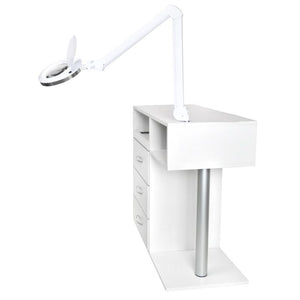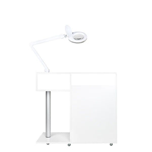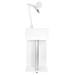 professional podiatry unit, solidly constructed with drawers with a special drawer for the uv-c sterilizer and a shelf for a milling machine. The whole is complemented by a lamp holder, a magnifying glass tube and metal-rubber wheels guarantee mobility. the assistant was created to facilitate the work of the person performing the procedure.