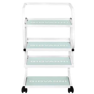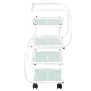 aesthetic table for a cosmetic device, made of metal and glass, with wheels. has four glass shelves.