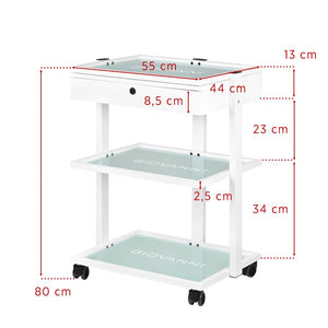 elegant metal and glass table, on rubber wheels. the table has a spacious drawer and two glass shelves with an engraved giovanni logo. it is possible to attach a lamp-magnifier to the table.