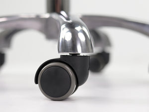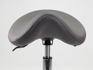 Ergonomic saddle stool. The contoured seat ensures optimal weight distribution and facilitates a natural posture. The solid construction provides stability and comfort. Wheels allow for smooth movement. The stool has an aluminum, chrome-plated frame.