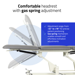 Adjustable headrest: the ability to adjust the angle of inclination using a gas spring from -32° to +78° allows for precise adjustment of the patient's position to the requirements of a given therapy.