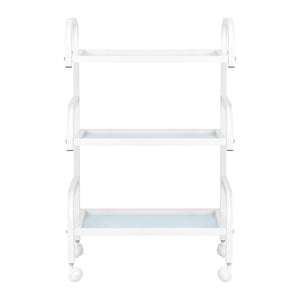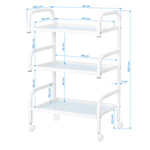 The frame made of durable aluminum in shades of white and the glass shelves create a modern and aesthetic whole that is easy to keep clean. Four wheels ensure mobility for easy organisation of the workspace, while solid materials guarantee stability and durability of use.