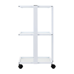The simple construction, a frame made of durable aluminum in shades of white and glass shelves combine elegance with practicality, ensuring the durability and stability of the furniture. The smooth surfaces make it easy to keep the table clean, and four wheels allow it to be moved freely, which increases the comfort of work in the salon. The elegant finish emphasises the professional character of the interior. There is a special place on the frame of the table, which allows for easy mounting of a professional magnifying lamp.