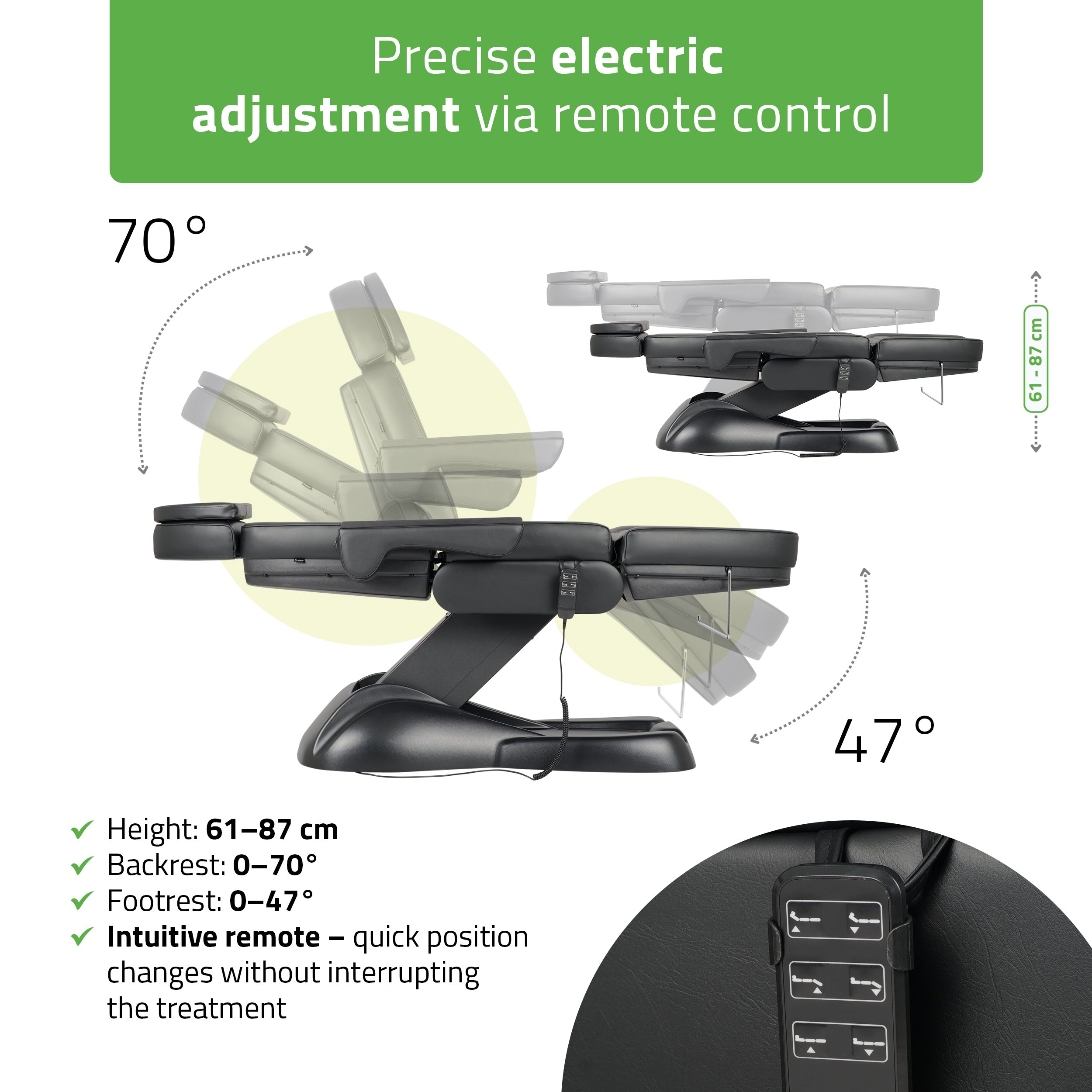 Electric adjustment in 3 planes: Height (61–87 cm), backrest tilt angle (0–70°), and footrest tilt angle (0–47°) can all be precisely set using an intuitive remote control.