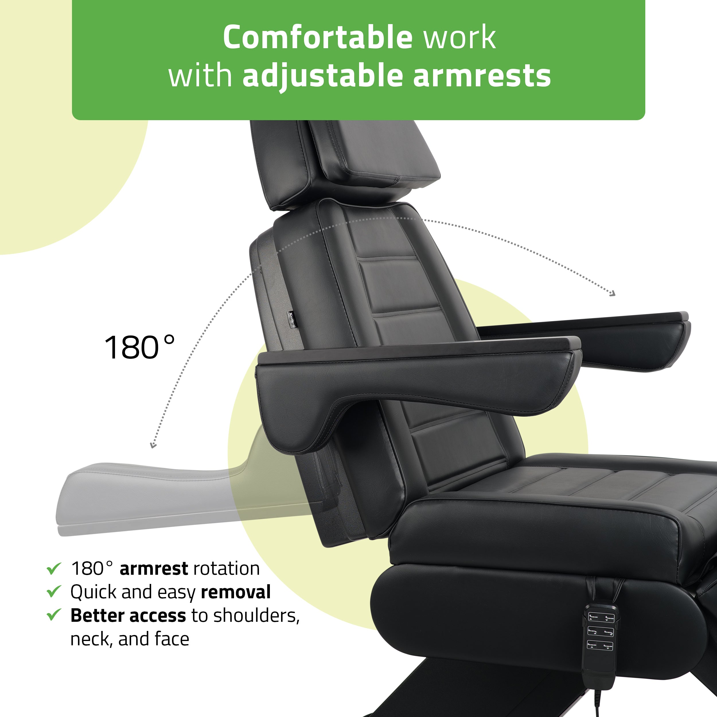 Removable and rotatable armrests: Armrests can be detached or rotated 180°, allowing for easy chair adjustment and more freedom of movement for both client and therapist.