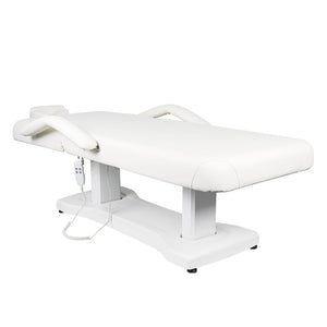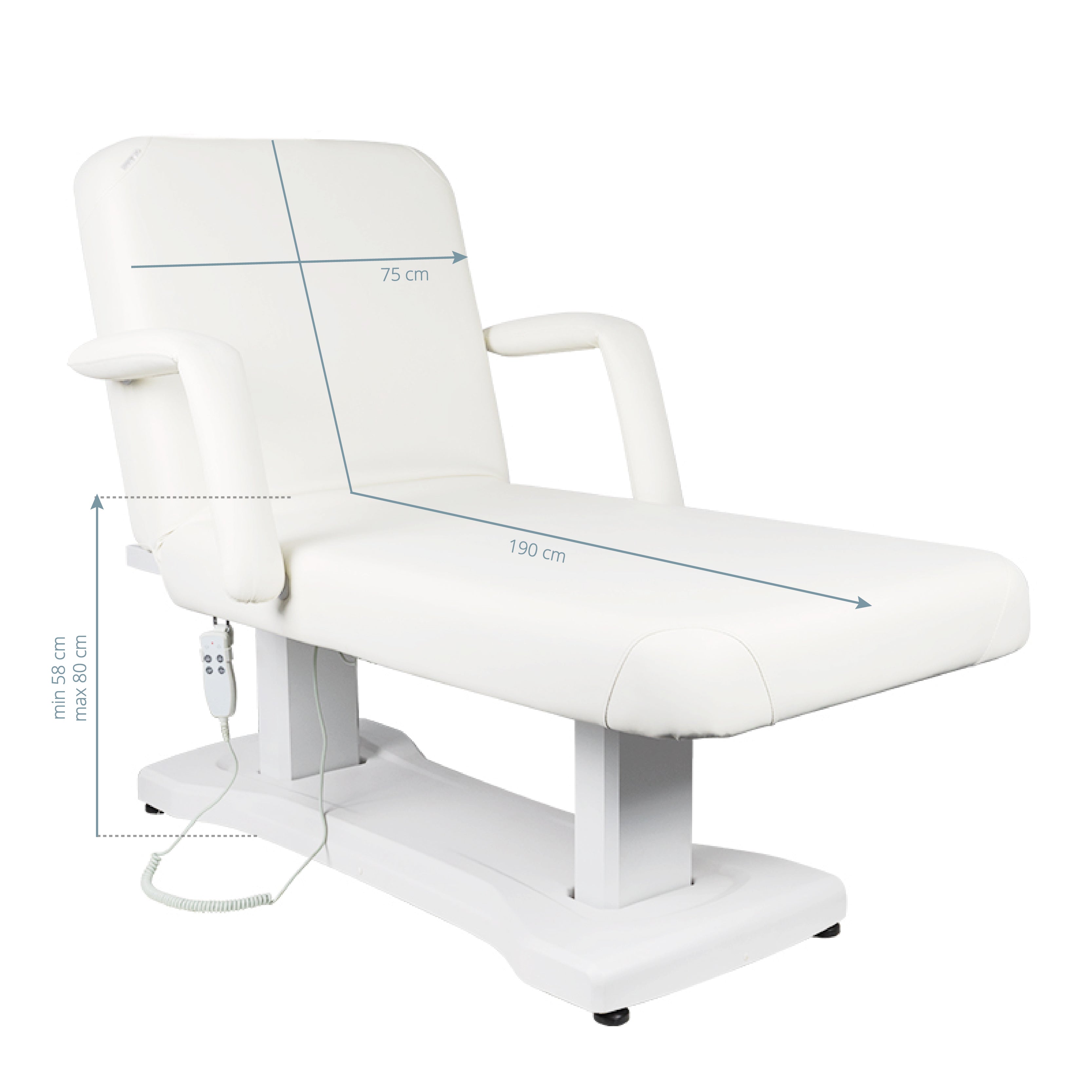 electric cosmetic bed adjustable in height in a very wide range from 58 to 80 cm. backrest and height are adjustable by remote control. a headrest with an opening for the face is attached to the backrest. a wide piece of furniture (75 cm), with a thick and very comfortable mattress. the bunk is very stable. it is upholstered with high-quality eco-leather.