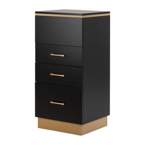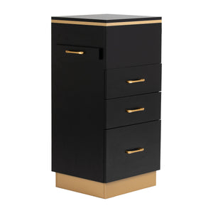 The Gabbiano 2027G hairdresser's helper is an elegant piece of equipment which will emphasise the character of a professional interior and improve everyday work organisation. The furniture is distinguished by a minimalist form in shades of black with gold details, which gives it a unique, luxurious look.