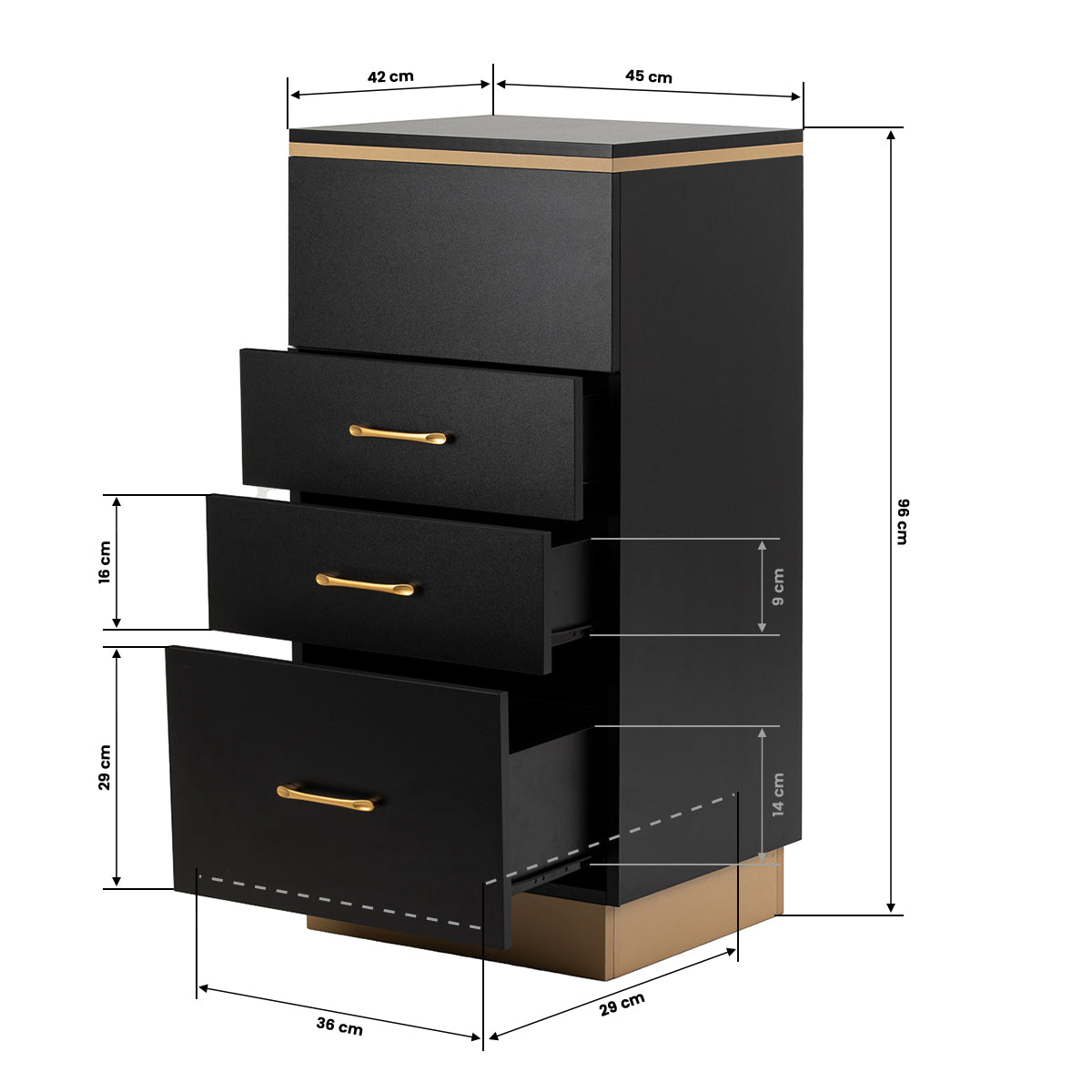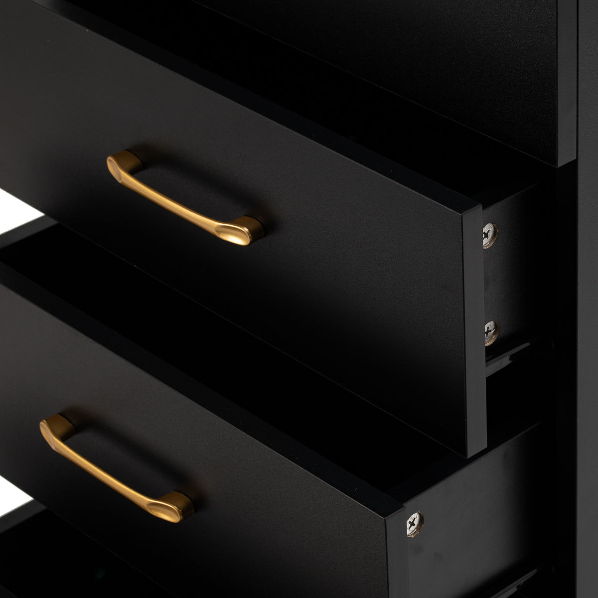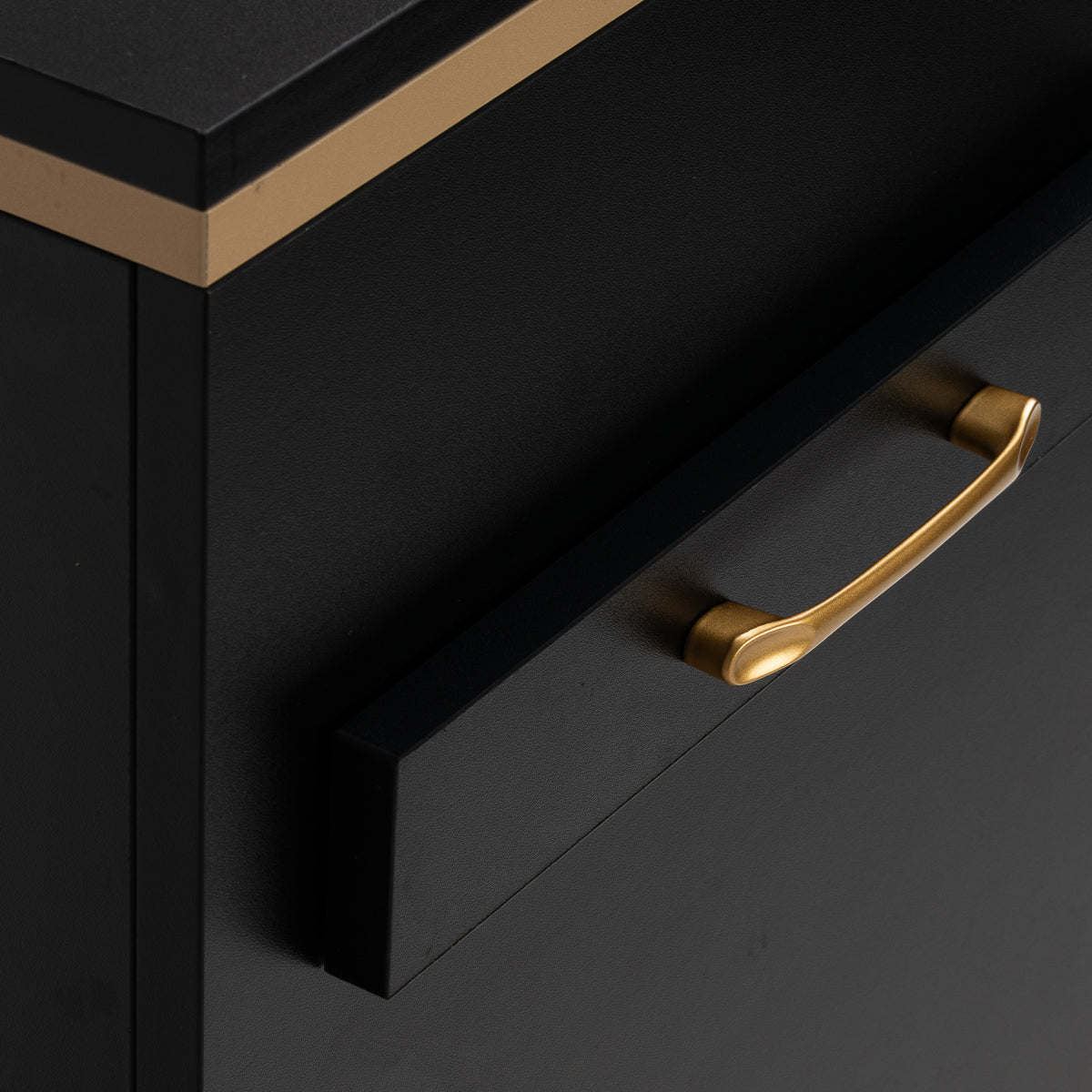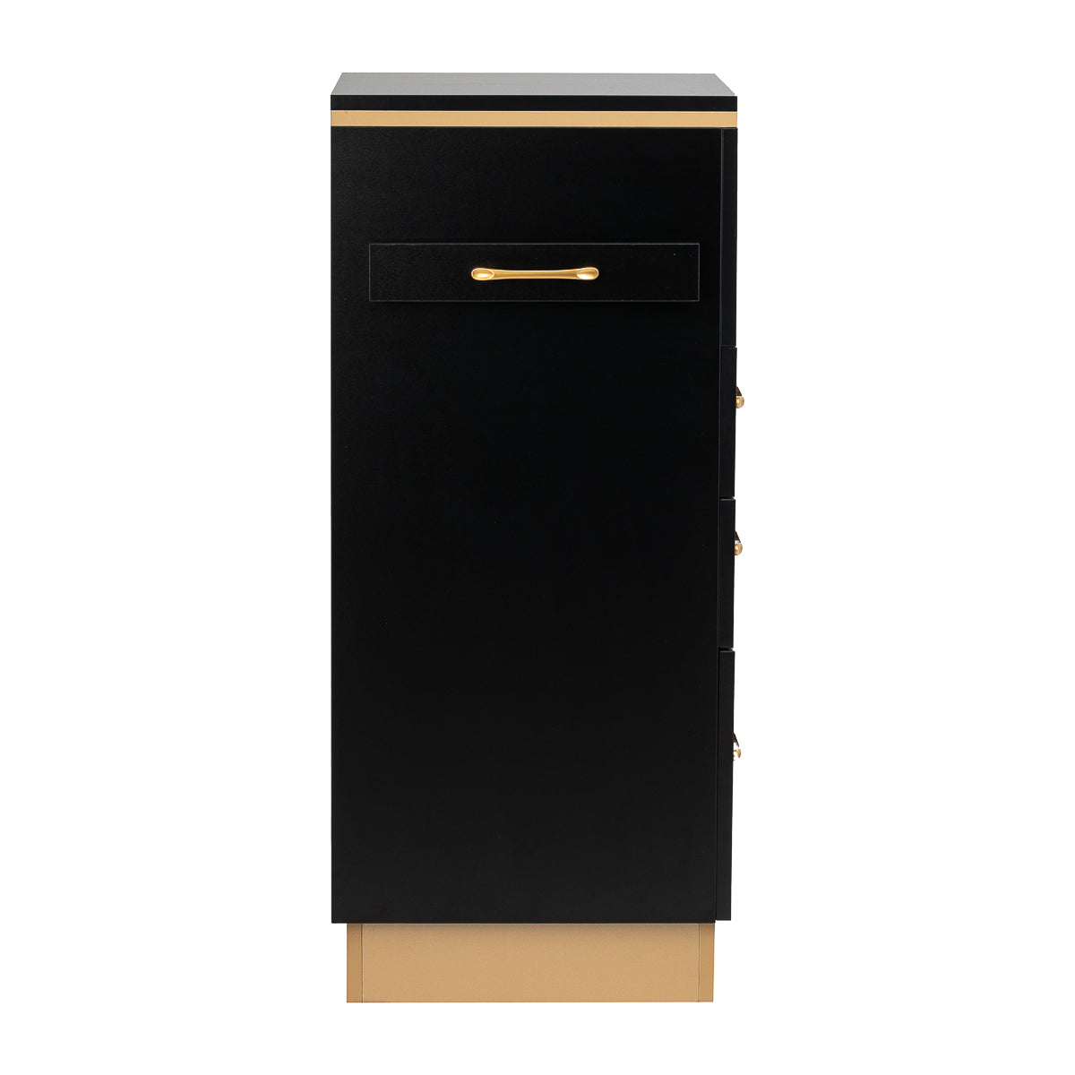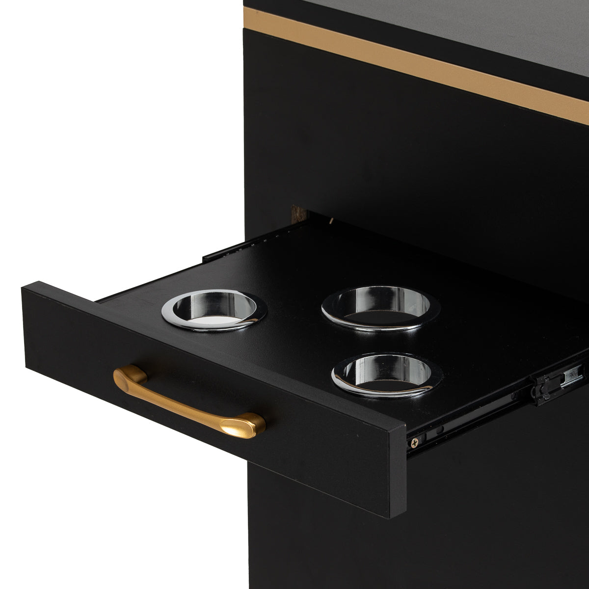 The combination of classic black and gold gives the helper a modern, prestigious character, which fits perfectly into both minimalist and more expressive arrangements. The solid construction ensures stability, while the smooth surface makes it easy to keep the furniture clean. The gold handles not only emphasise the elegant design, but also ensure convenient opening of each drawer. It is a practical solution for a hairdressing salon, where order, convenient access to tools and aesthetics of the workstation matter.