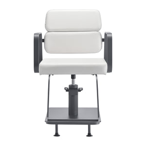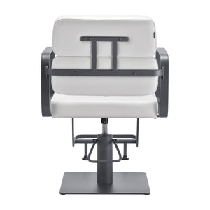 The full rotation mechanism of the chair makes the hairdresser's work more effective and comfortable. A solid, flat, square-shaped base guarantees stability during use. The matte-finished, smooth surface gives the element an elegant look and makes it easy to keep clean. A comfortable seat with foam filling ensures high comfort of use, even during many hours of treatments. Geometric, metal armrests allow for the correct positioning of the client's shoulders – this means that he does not bury his head in his shoulders or slouch – which makes it much easier to perform precise treatments, including haircuts. A stylish footrest dedicated to this model provides stable support for the user's feet.