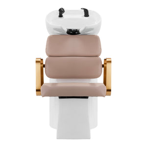 The profiled chair provides adequate lumbar support and, therefore, high comfort of use. Metal armrests in shades of gold with a geometric shape allow for the correct positioning of the customer's shoulders. Filling with durable, deformation-resistant foam and upholstery made of pleasant-to-touch synthetic leather in shades of beige ensure the durability of the furniture, ease of cleaning and comfortable use for a long time. The original, elegant appearance of the hair wash unit gives the interior a unique expression. The set includes complete fittings in shades of black, including a faucet, a shower head and dedicated hoses to provide a complete set of tools for work.