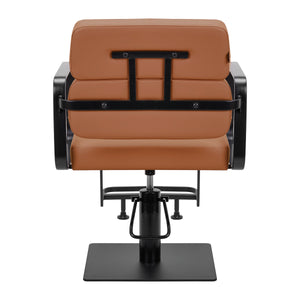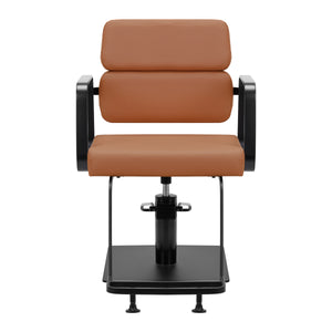 The full rotation mechanism of the chair makes the hairdresser's work more effective and comfortable. A solid, flat, square-shaped base guarantees stability during use. The matte-finished, smooth surface gives the element an elegant look and makes it easy to keep clean. A comfortable seat with foam filling ensures high comfort of use, even during many hours of treatments. Geometric, metal armrests allow for the correct positioning of the client's shoulders – this means that he does not bury his head in his shoulders or slouch – which makes it much easier to perform precise treatments, including haircuts. A stylish footrest dedicated to this model provides stable support for the user's feet.