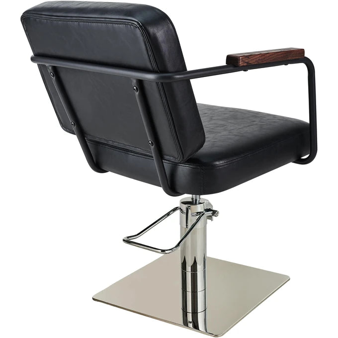The ENZO styling chair is a perfect match for industrial, boho, and Scandinavian interiors. The combination of metal, wood, and textured upholstery creates a timeless look that gives the salon real personality. Its geometric form draws attention and leaves an impression on every client. Black upholstery
