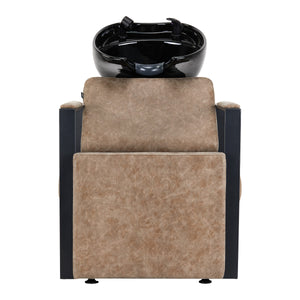 A properly profiled chair filled with durable foam ensures high comfort of use and geometric, partially upholstered armrests allow for correct positioning of the client's shoulders. The backrest is placed at an optimal angle and provides excellent support for the spine. Cover made of synthetic leather in shades of brown guarantees long-term durability and ease of cleaning. The original, elegant look of wash adds the interior's unique expression. Stabilization legs add stability and subtly emphasize the stylish character of the hairdressing wash unit. The set includes complete fittings with a matte finish in shades of black, including a faucet, shower head and dedicated hoses to provide a complete set of tools for work.