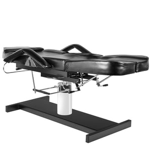 swivel chair with a blockade, with divided footrests, hydraulically lifted and lowered, with a hole in the headrest, perfect for cosmetics, treatments pedicure, make-up and massage. it has removable armrests and a plug in the headrest. Easily washable seat cover, made of eco-leather, meeting the stringent EU requirements, aesthetic, nickel-plated metal elements. the armchair is available in black.