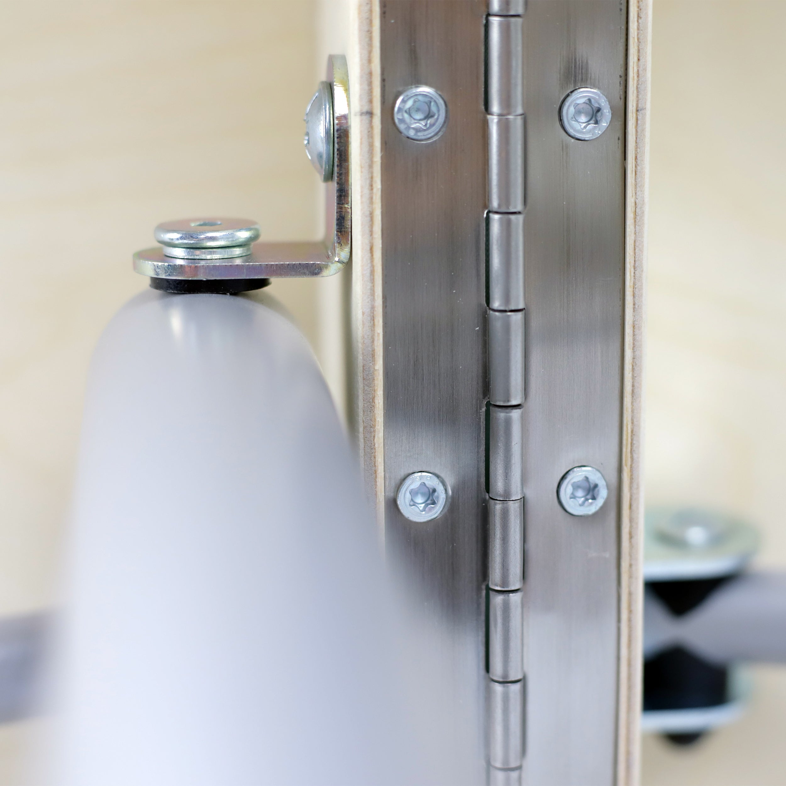 Durable stainless steel hinge, protected by a protective upholstery collar