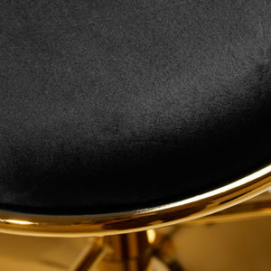 Miellyttävän tuntuinen samettiverhoilu mustan sävyissä antaa jakkaralle ainutlaatuisen luonteen, ja selkänojan esteettisesti punottu kangas korostaa huonekalun uniikkia ulkonäköä. Viimeistely tekee huonekalusta katseenvangitsijan. Kullan sävyinen runko lisää eleganssia ja arvokkuutta sopien täydellisesti yhteen sametin kanssa.