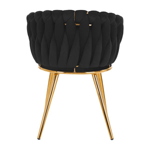 Miellyttävän tuntuinen samettiverhoilu mustan sävyissä antaa tuolille ainutlaatuisen luonteen, ja selkänojan esteettisesti punottu kangas korostaa huonekalun uniikkia ulkonäköä. Tämä antaa sille ylellisen ilmeen ja varmistaa käyttömukavuuden. Kullanvärinen runko lisää eleganssia ja arvokkuutta, sopien täydellisesti yhteen sametin kanssa. Elegantti 4Rico-tuoli on erittäin mukava huonekalu, joka koristaa minkä tahansa kauneushoitolan vastaanottotilaa.