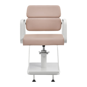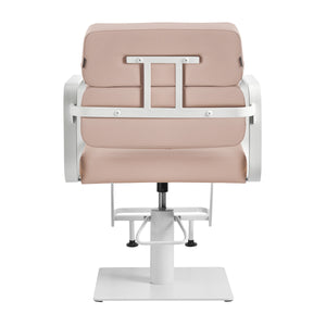 Tuolin täysi kääntömekanismi tekee kampaajan työstä tehokkaampaa ja mukavampaa. Tukeva, litteä neliönmuotoinen jalusta takaa vakauden käytön aikana. Mattapintainen, sileä pinta antaa osalle tyylikkään ilmeen ja tekee siitä helpon pitää puhtaana. Mukava vaahtomuovitäytteinen istuin takaa korkean käyttömukavuuden jopa tuntien pituisten hoitojen aikana. Geometriset, metalliset käsinojat mahdollistavat asiakkaan hartioiden oikean asennon – tämä tarkoittaa, ettei hän upota päätään hartioihin tai kumarru – mikä helpottaa huomattavasti tarkkojen toimenpiteiden, kuten hiustenleikkausten, suorittamista. Tälle mallille suunniteltu tyylikäs jalkatuki tarjoaa vakaan tuen käyttäjän jaloille.