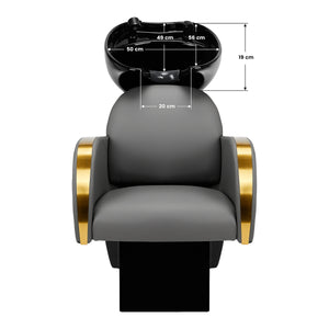 Oikein muotoiltu, kestävällä vaahdolla täytetty tuoli takaa korkean käyttömukavuuden, ja tyylikkäät käsinojat mahdollistavat asiakkaan hartioiden oikean asennon. Selkänoja on asetettu optimaaliseen kulmaan, jotta voit ottaa oikean asennon ja se tukee selkärankaa erinomaisesti. Harmaan sävyinen verhoilu ja kullanväriset lakatut metallipinnat antavat sille ajattoman eleganssin ja takaavat lisäksi pitkäaikaisen kestävyyden ja helpon puhdistuksen. Pesupaikan erottuva klassinen viimeistely saa sen näyttämään upealta melkein missä tahansa tilassa. Setti sisältää täydelliset mustat varusteet, mukaan lukien hanan, suihkupään ja letkut, tarjoten täydellisen työkalusarjan työhön.