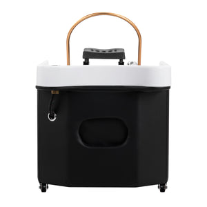 Laite kiinnittää huomion modernilla muodollaan ja kontrastisella väriyhdistelmällään – tyylikäs valkoinen kohtaa syvän mustan. Minimalistinen runko pyöristetyillä reunoilla näyttää tyylikkäältä ja ammattimaiselta, sopien täydellisesti modernien kauneushoitoloiden ja SPA-salongien sisustukseen. Pesupaikka on varustettu lukittavilla pyörillä, mikä takaa helpon kuljetuksen ja vakauden käytön aikana. Se on ihanteellinen ratkaisu pienempiin tiloihin – yksi mobiili laite voi palvella useita hoitopisteitä, mikä tekee siitä erittäin toiminnallisen ja taloudellisen valinnan.