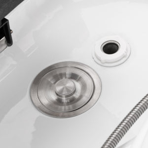 Pesupaikka on varustettu sekoittajalla, jonka avulla lämpötila on helppo säätää asiakkaan toiveiden mukaiseksi. Suihkukahvan pidike helpottaa työskentelyä, ja kromattu tulppa siivilällä mahdollistaa veden virtauksen hallinnan ja korkean hygieniatason ylläpitämisen. Vesiliitäntä on piilotettu rungon sisään joustavan suojuksen taakse, mikä mahdollistaa putkistojen esteettisen piilottamisen ja laitteen ammattimaisen ulkonäön säilyttämisen.
