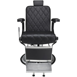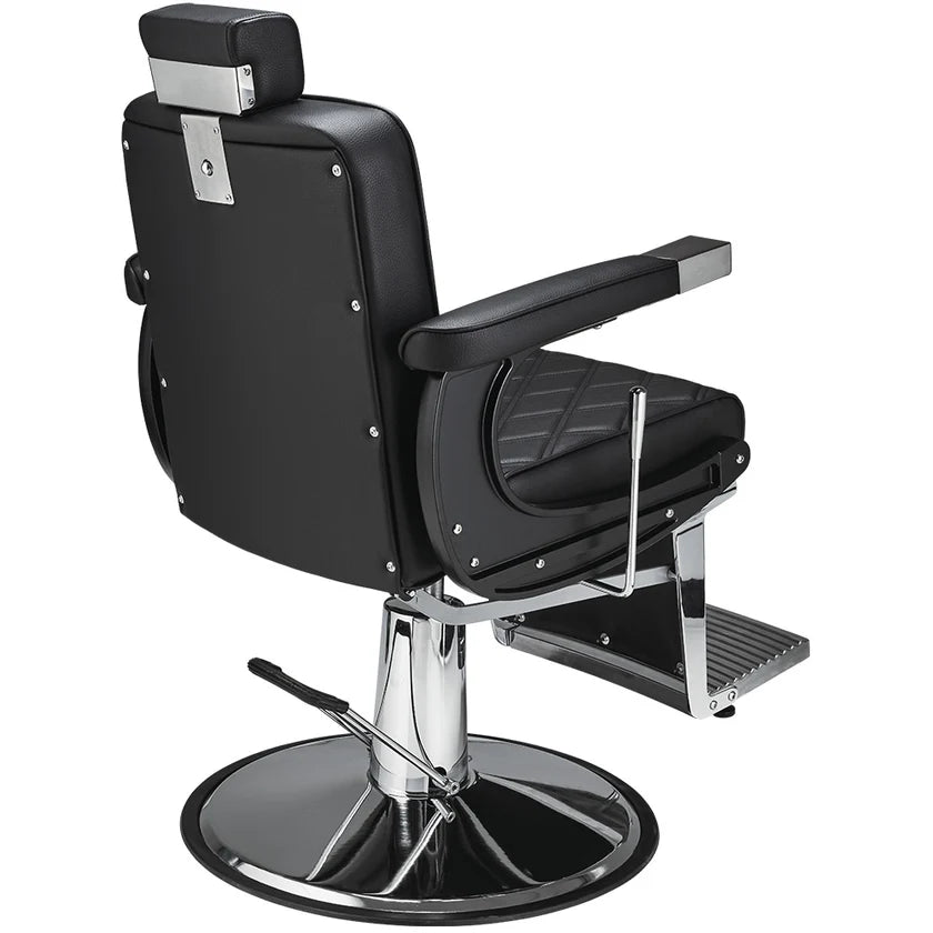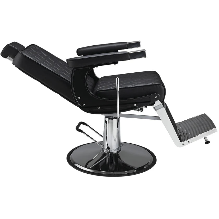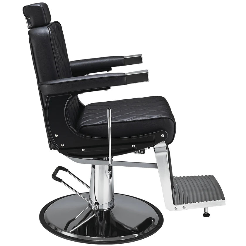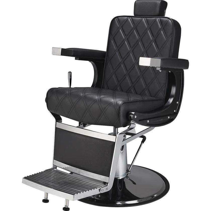 A model designed for lovers of modern interiors. Elegant barber chair with diamond-stitched black upholstery, adjustable headrest, and stainless steel footrest. A solid base ensures stability and comfort in everyday use. Black upholstery
