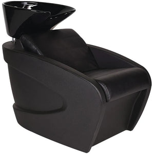 The VANITY Backwash features a futuristic, dynamic silhouette inspired by retro-futuristic aesthetics. A comfortable seat, large EUROPA basin, and durable base make it a long-term investment. Perfect for salons that want to stand out. Black upholstery