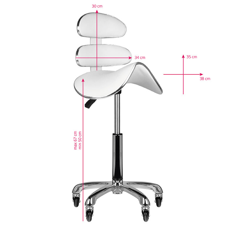 Mukava, vakaa kosmeettinen jakkara muotoillulla istuimella ja ergonomisella selkänojalla. Asennettu viisivaiheiseen jalustaan, jossa on laadukkaat muoviset Speed-pyörät, jotka takaavat helpon liikkumisen. Valmistettu valkoisesta ekonahasta.