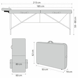 Nadia is a universal folding massage table with an aluminum construction, fully equipped with a cover and additional accessories. The model features a two-section top with comfortable 5 cm foam, consisting of two layers of different hardness. The first is soft with a thickness of 4 cm, and the second is slightly harder with a thickness of 1 cm. This makes the table not only exceptionally comfortable for the patient but also comfortable for the therapist.