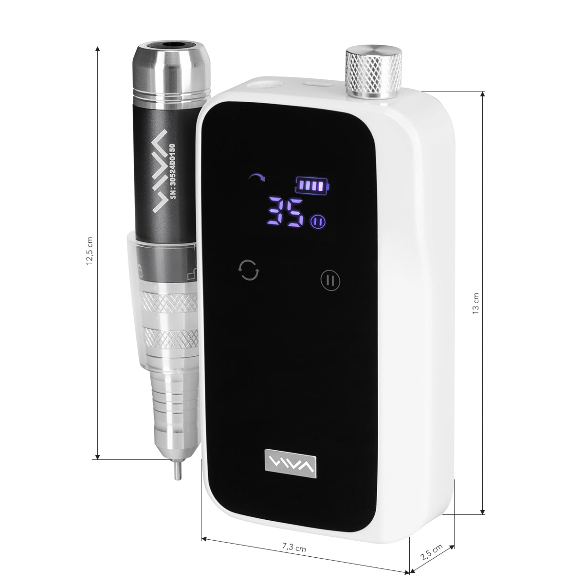 Käytännöllinen johdoton VIVA 305 -kynsipora on kompakti laite, joka sopii täydellisesti liikkuville kynsiteknikoille mahdollistaen mukavan työskentelyn missä tahansa. Se helpottaa huomattavasti vanhojen kynsien muotoilujen poistamista ja parantaa kynsien valmistelua jatkokäsittelyjä varten. Se mahdollistaa miellyttävän työskentelyn jopa 10 tunnin ajan yhdellä latauksella.